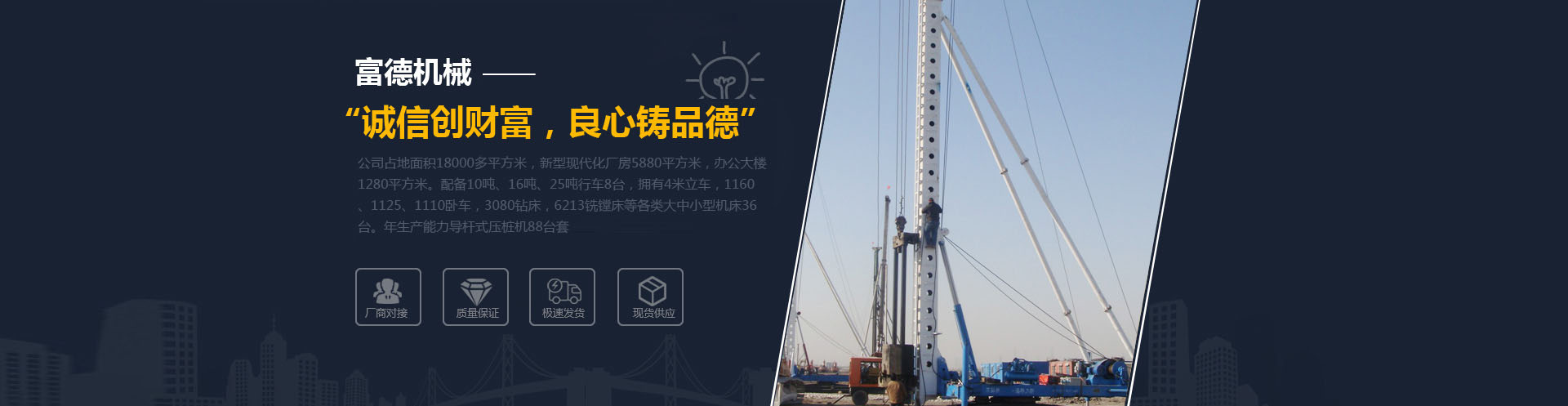東臺(tái)市富德機(jī)械有限公司位于江蘇東臺(tái)經(jīng)濟(jì)開(kāi)發(fā)區(qū),自然條件優(yōu)厚,廠(chǎng)區(qū)環(huán)境優(yōu)美,交通運(yùn)輸便捷。公司占地面積18000多平方米,新型現(xiàn)代化廠(chǎng)房5880平方米,辦公大樓1280平方米。配備10噸、16噸、25噸行車(chē)8臺(tái),擁有4米立車(chē),1160、1125、1110臥車(chē),3080鉆床,6213銑鏜床等各類(lèi)大中小型機(jī)床36臺(tái)。年生產(chǎn)能力導(dǎo)桿式壓樁機(jī)88臺(tái)套,同行業(yè) 。產(chǎn)品暢銷(xiāo)北京、天津、廣東、廣西、海南、福建、浙江、上海、安徽、山東、山西、陜西、甘肅、湖北、湖南、江蘇等20多個(gè)省……